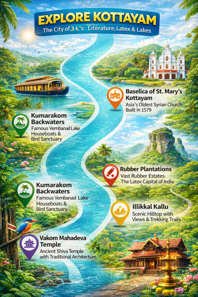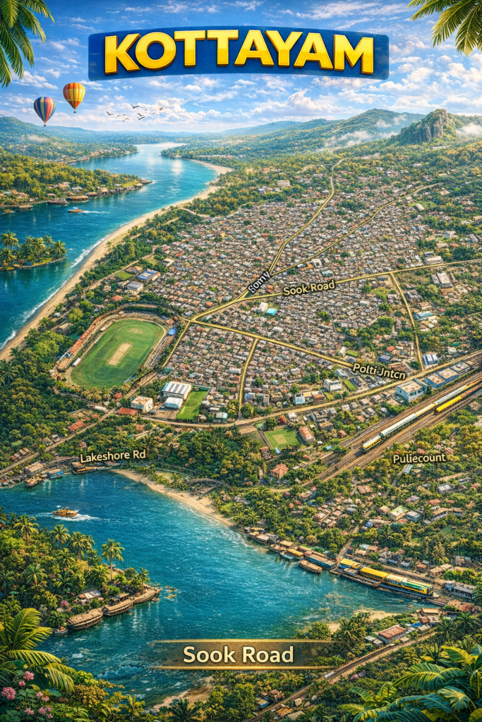 Kottayam is a prominent municipality and district headquarters in the central part of Kerala, India. Nestled between the Western Ghats and the Vembanad Lake, the town is known for its rich literary, educational, and cultural heritage. Often referred to as the “Land of Letters, Latex, and Lakes,” Kottayam was the first town in India to achieve 100% literacy. It serves as an important administrative, commercial, and cultural hub of Central Kerala.